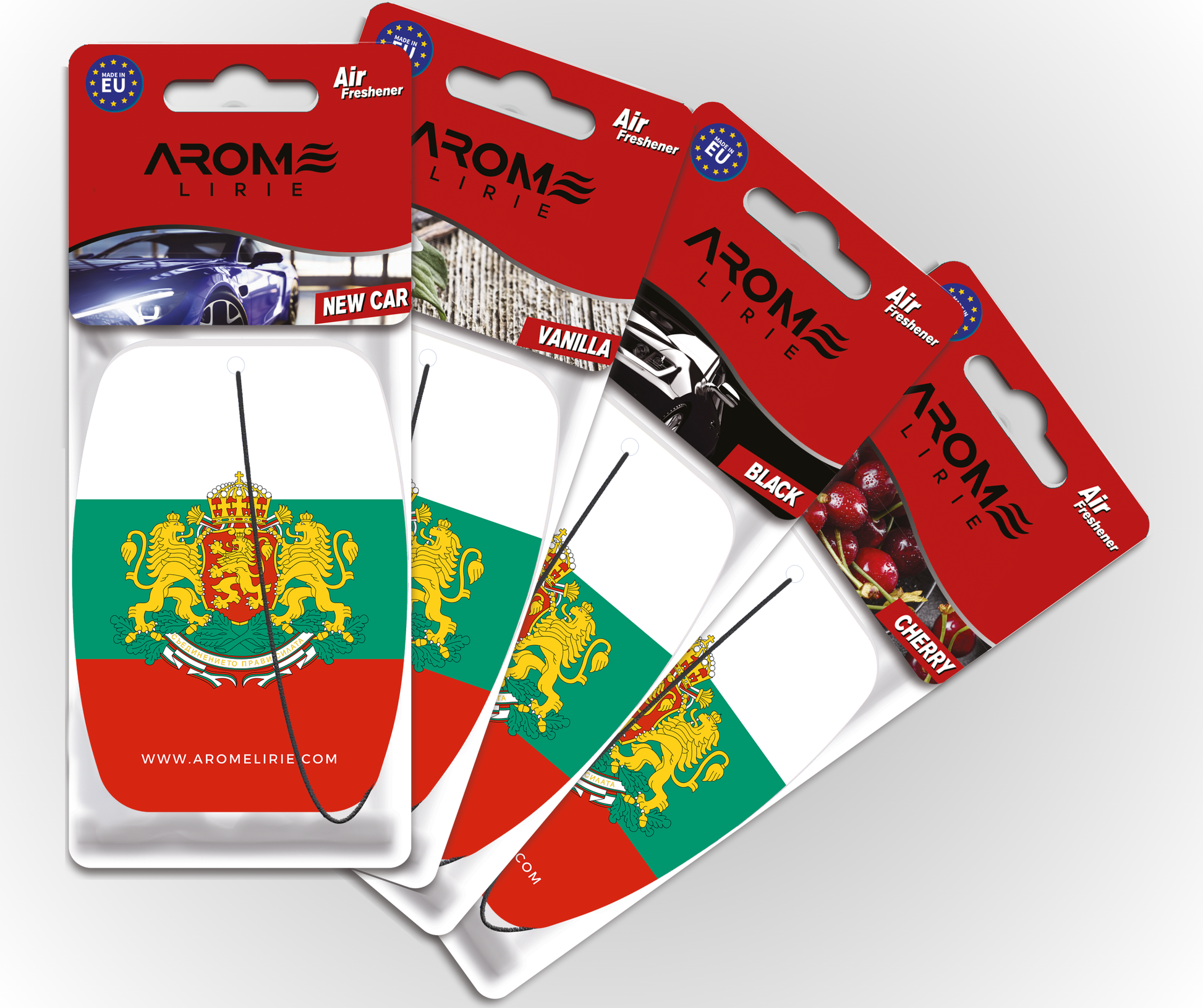 Das Arome Lirie Bulgarien Duftbaum-Set verbindet die klassische bulgarische Flagge mit dem goldenen Staatswappen und vier starken Duftsorten.